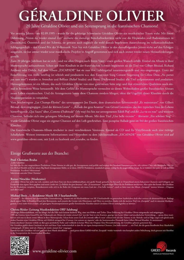 Für das Frühjahr 2019 dürfen sich ihre Fans dann auf das neue Schlageralbum freuen. Zwölf ganz neue Titel, für die sich Géraldine Olivier ein ganz starkes Team mit Willy Klüter, Bernd Meinunger und Jeo Mezei (jeopark) zusammengestellt hat.