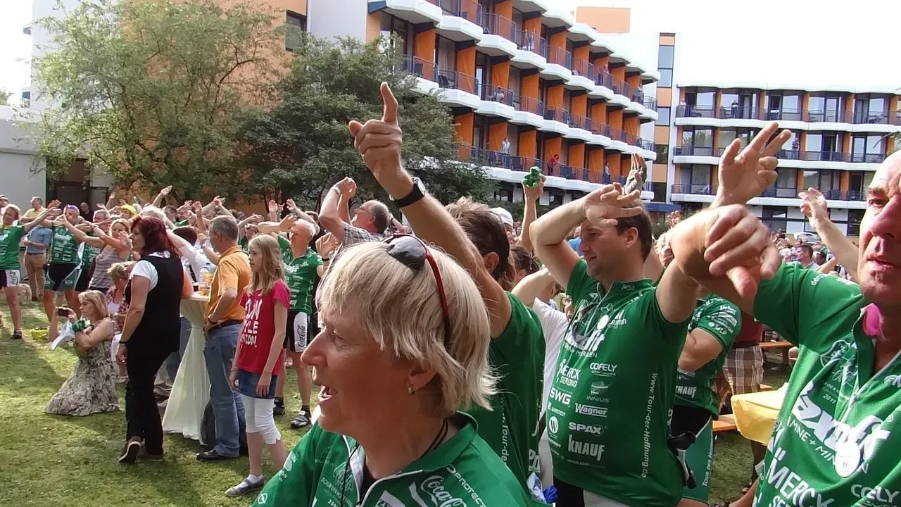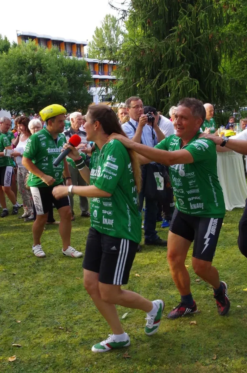 "Liebe Tourfamilie, liebe Taufpaten, liebes Publikum, nun ist ein Maskottchen mit dem Namen „Lulu“ zum 30. Jährigen Jubiläum der Tour der Hoffnung geboren und hängt schon an euren Fahrrädern. 2012 kam mir nun durch Michi DIE Idee! Das ist es doch! Wir brauchen ein Maskottchen, welches zu unserer Tour passt! Ein Schutzengel! UND NUN BRAUCHTEN WIR NOCH EINEN SPONSOR! Ich rief Jupp Kapellmann über Skype nach Saoudi Arabien an und fragte ihn, ob er vielleicht jemand kennen würde, der für unser LULU als Sponsor passen würde … Und hier sind sie die Sponsoren unseres LULUs, die Herren Joachim Großschädl und Matthias Gahrmann, die Geschäftsführer des Klinikzentrums Mühlengrund. Wir bedanken uns von Herzen für das Sponsoring von LULU und für die tolle hessische Gastfreundschaft. Und nun gebe ich gerne das Mikrophon an Michaela Axer weiter"